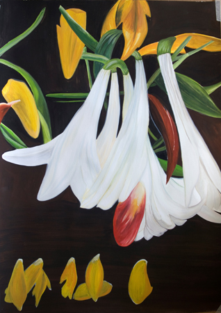 De in Rotterdam geboren en momenteel in Geldrop wonende Margreet Koelen (1954) hield zich van kleins af aan al bezig met tekenen en schilderen. Het is dan ook geen verrassing dat ze een kunstacademische opleiding in Tilburg volgde en zich daarna altijd met kunst is bezig blijven houden. Margreets stijl is afwisselend, maar herkenbaar. Ze maakt graag gebruik van verschillende materialen, waaronder olieverf, gouache, krijt en inkt. Kleur- en lijnenspel is belangrijk in de werken die Margreet tentoon stelt in Open Galerie Helmond. Ze ordent de bloemen en bladeren op een intuďtieve manier, dat niet alleen kleur en compositie, maar ook de sfeer van het uiteindelijke werk helemaal kloppen. Natuur en abstractie komen zo samen in deze werken.