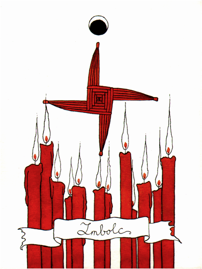 Imbolc is celebrated on February 2nd, and is also known as Candlemas. This day is dedicated to the Virgin Mary, and also to St. Brigit, or the goddess Brigit. Her cross is here depicted, as are candles that symbolize the returning light.